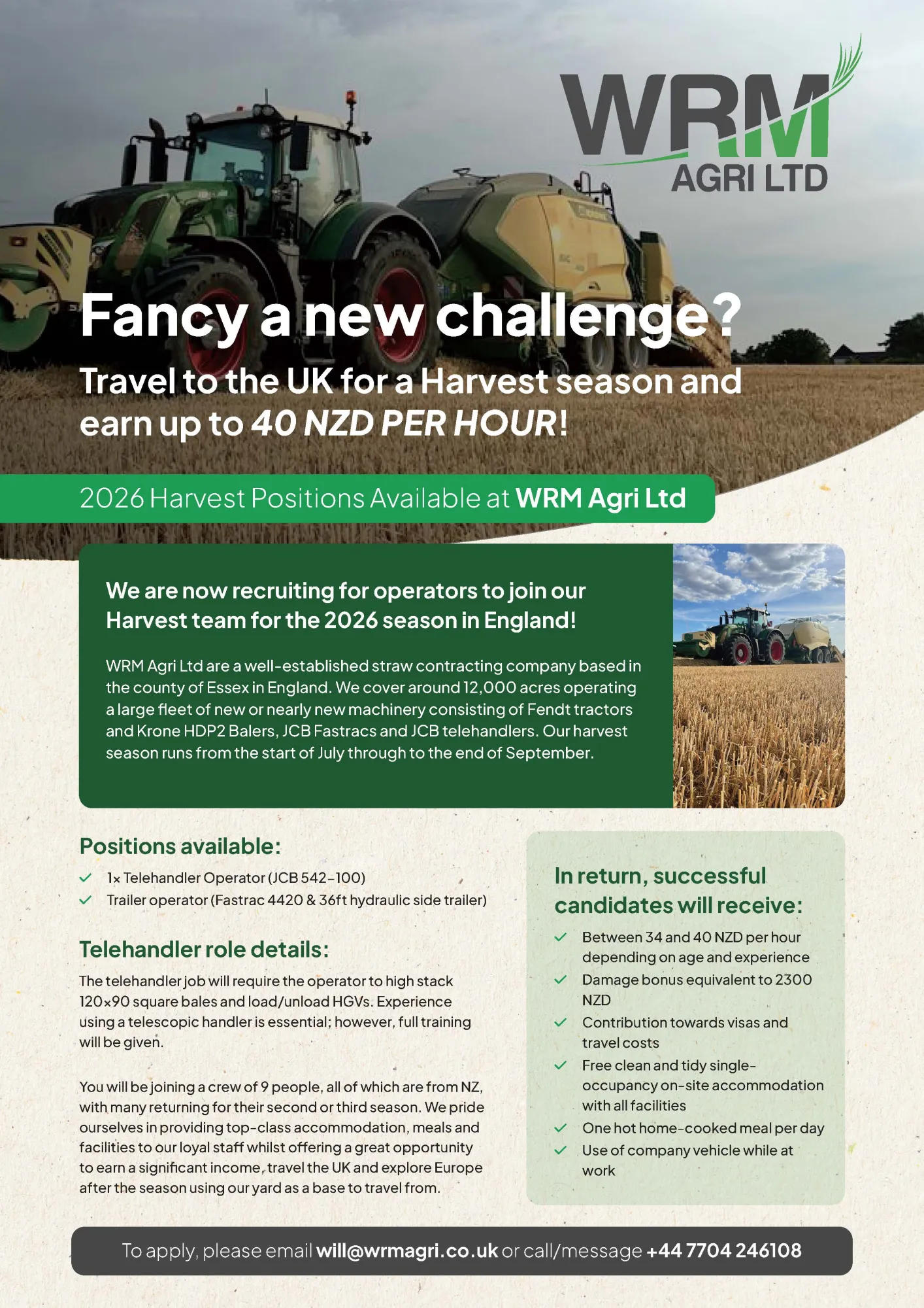 WRM Agri Ltd are now recruiting for skilled operators to join our harvest crew for 2026.